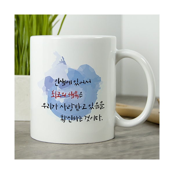 자연스러운 번짐효과의 배경에 캘리로 포인트를 가미한 머그컵